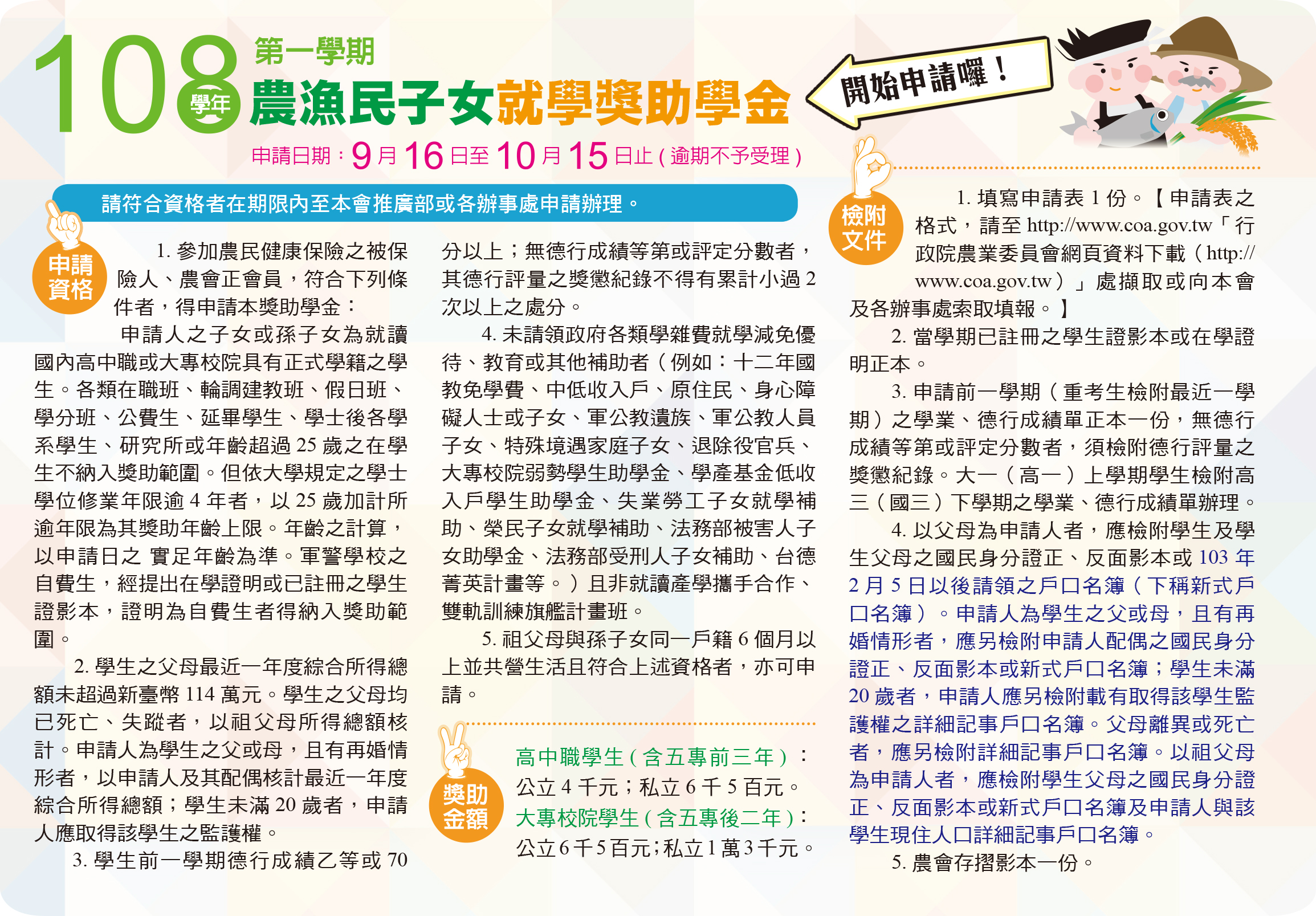 更多農漁民子女獎學金資訊請至農委會網站:https://www.coa.gov.tw/ws.php?id=1518