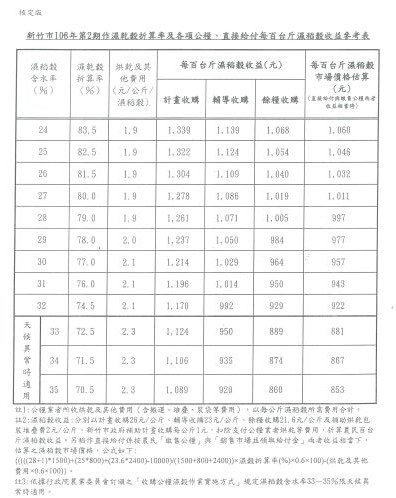 108年第二期作濕乾穀折算率及各項公糧、直接給付收益參考表